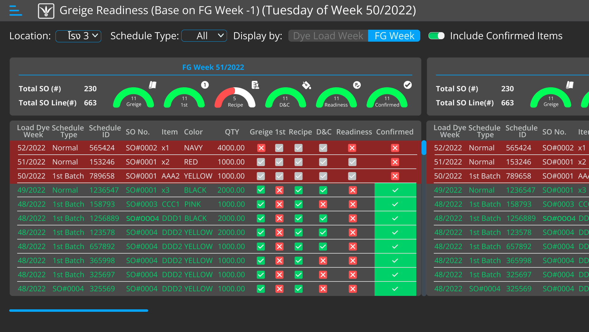 Displays the dyeing plan list with readiness details for each item, and summarizes weekly progress, enabling SCM to confirm readiness before dyeing can proceed.