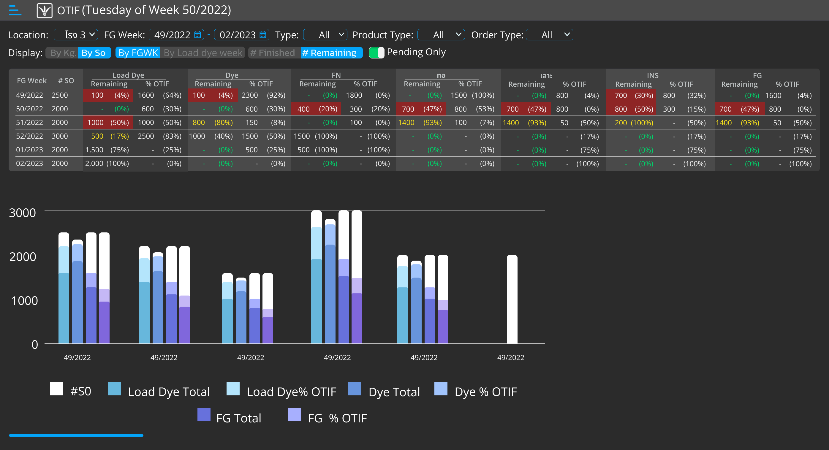 Displays a weekly summary of how many SOs remain in each process, along with OTIF performance per process, providing an overall view of where SOs are currently located in the workflow. OTIF results are calculated and displayed by week to support continuous improvement. The summary can be viewed in two perspectives: FG Week and Load Dye Week, and users can drill down into the details of outstanding items.