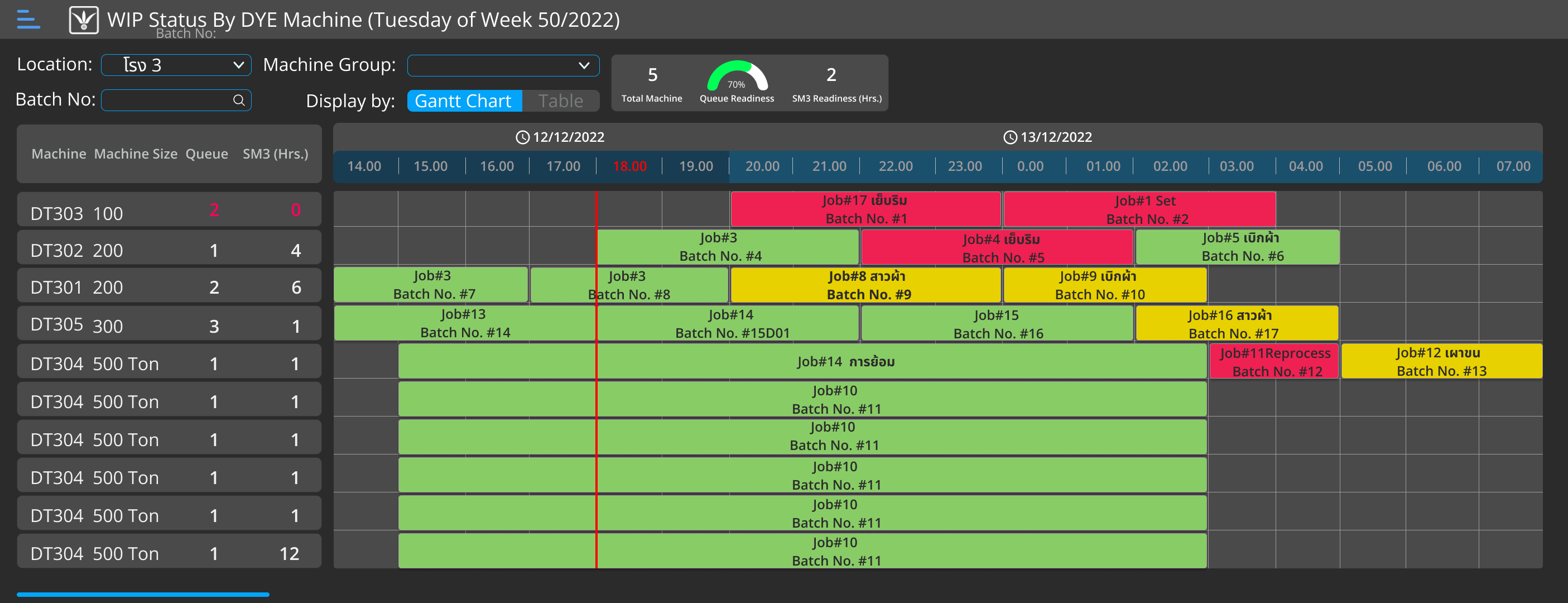 Displays the dyeing queue for each machine by dye house, enabling the Fabric Center and PPC teams to review queue readiness and confirm whether each queue is ready to proceed as planned. Views are available in both Gantt chart and table formats.