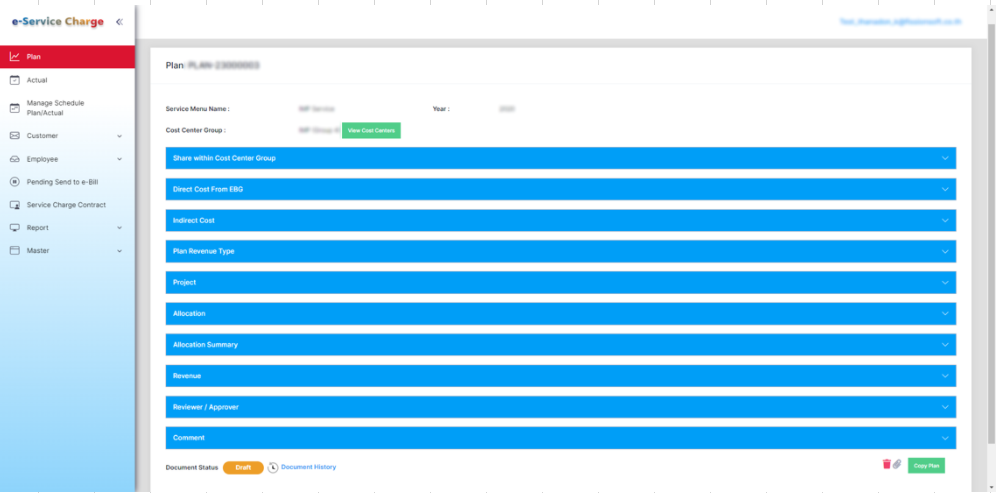 A system designed to calculate service charge revenue based on actual incurred costs. The system enables organizations to create service charge plans using historical data from previous years and define flexible charging formulas, including proportional allocation by usage percentage, headcount-based allocation, or fixed-rate charging.