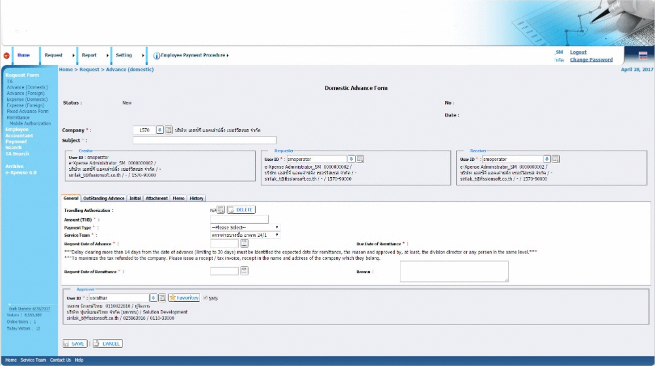 The system that provide approval workflows of Traveling Authorization request, Cash Advance request, Expense Reimbursement and Remittance request, post accounting transactions to SAP when complete. The system is currently using by all employees including international staffs.